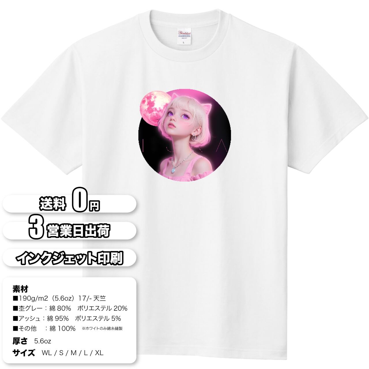 幻想的な満月と、ネコ耳を持つ可憐な少女「LUNA」を描いた、夢かわいい&近未来感あふれるオリジナルTシャツ。