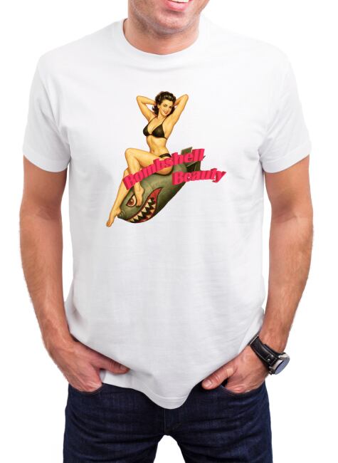 このTシャツは、第二次世界大戦中の航空機に描かれた「ノーズアート」を彷彿とさせる、魅力的なヴィンテージピンナップガールのアートワークをフィーチャーした絵柄は「Bombshell Beauty」と題され、戦時中のパイロットたちを魅了し、士気を高めたであろう女性の姿が描かれています。