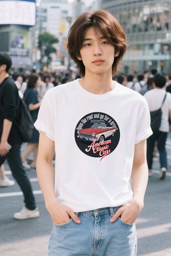 アメリカンカルチャー好き必見!「American Classic Cars」をテーマにした、レトロで味わい深いアメ車イラストを大胆にプリントしたデザインTシャツが登場。赤と白のコンバーチブルが目を惹くこの一枚は、オープンカーで風を感じながらドライブする自由な気分をそのままファッションに落とし込んでいます。