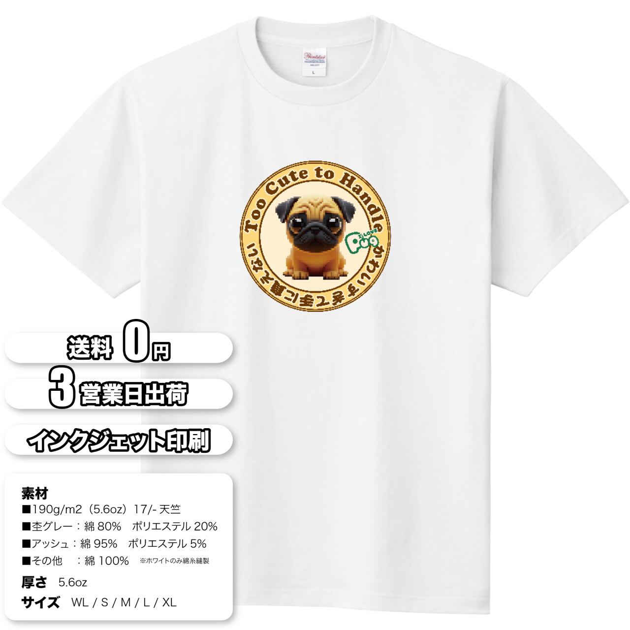 パグ好きさん必見!「Too Cute to Handle(可愛すぎて手に負えない!)」をテーマにした、愛らしいパグのTシャツが登場です。
