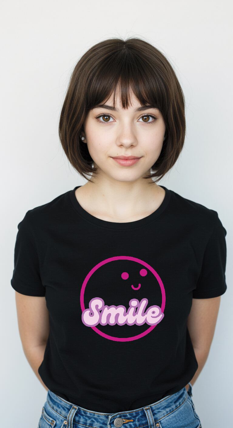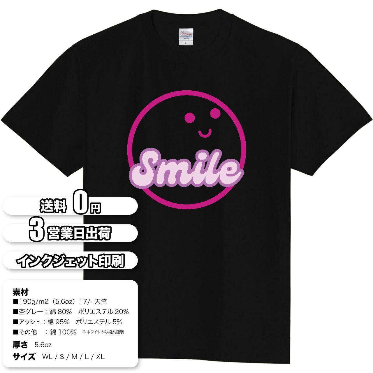 このTシャツは、ピンクのスマイルフェイスにやさしい筆記体の「Smile」ロゴをあしらった、シンプルでかわいらしいデザイン。見た人の心をふわっと明るくしてくれる、そんなあたたかい1枚です。