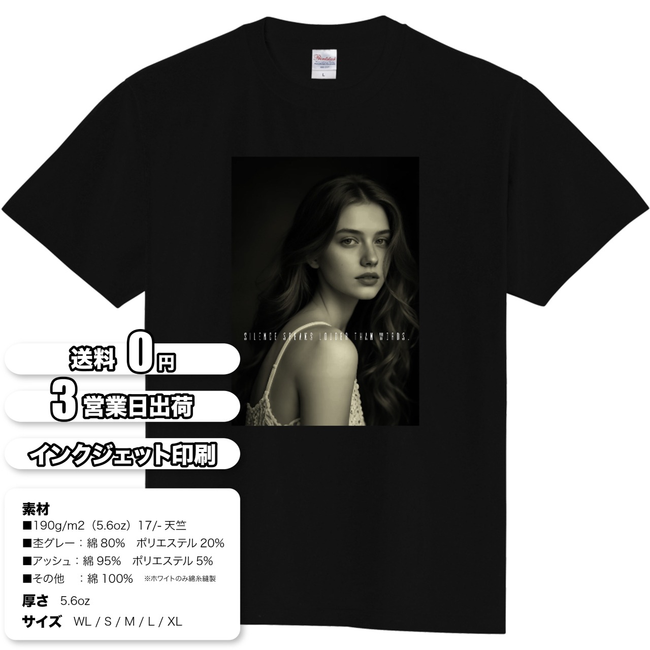 言葉では語り尽くせない、深いメッセージを秘めたTシャツが登場!この「Silence Speaks Louder Than Words.」メッセージTシャツは、静かなる美しさと力強い存在感を兼ね備えた、まさにアートピースです。モノクロームのポートレートに添えられた、示唆に富んだ英文「SILENCE SPEAKS LOUDER THAN WORDS.(沈黙は言葉よりも雄弁である)」は、着る人の内面的な強さと知性を表現します。