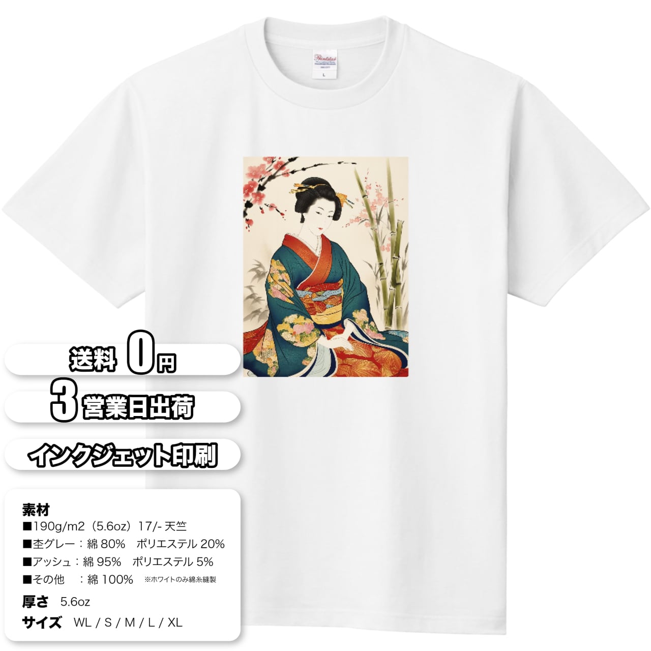 日本の伝統美が息づく、唯一無二のTシャツがここに誕生しました!この「麗しの着物美人Tシャツ」は、優雅な着物を身に纏った女性が、桜と竹の襖を背景に佇む姿を描いた、まるで一枚の浮世絵のようなデザインです。繊細なタッチで描かれた着物の模様、女性の表情、そして背景の植物が織りなすハーモニーは、見る人を日本の雅な世界へと誘います。