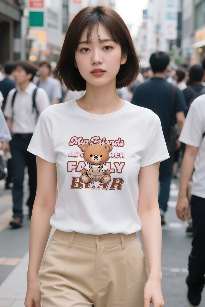 このTシャツは、見ているだけで心温まる、愛らしい子ぐまのキャラクターが主役のデザインです。オーバーオールを着た、つぶらな瞳の子ぐまさんがちょこんと座る姿は、見る人すべてを笑顔にしてくれます。「My Friends」「Adventurer」「Family」「Bear」というメッセージが、このクマさんが大切な仲間や家族の一員であることを示唆し、友情や温かい絆を感じさせます。どこか懐かしく、そして新しい、そんな魅力が詰まった一枚です。