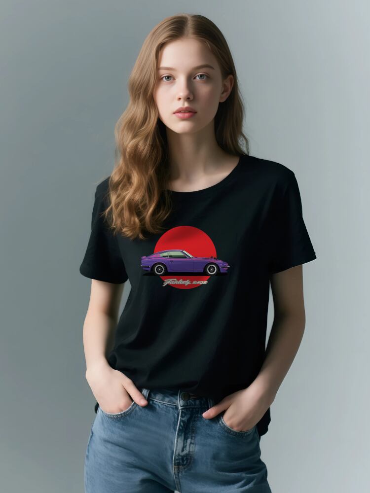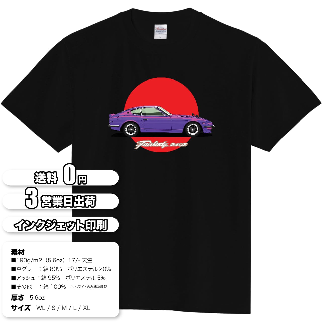 このTシャツは、日本の自動車史に名を刻む伝説的なスポーツカー、日産「フェアレディZ 240Z(S30型)」の美しいイラストをフィーチャーした一枚です。鮮やかなパープルに彩られたボディが、その流麗なフォルムを一層際立たせています。背景に描かれた日本の国旗を思わせる大きな赤い円が、この名車が持つ国産スポーツカーとしてのプライドと、太陽のような情熱を象徴しています。