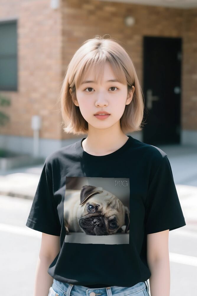 愛らしい瞳でこちらを見つめる、子犬パグのオリジナルイラストがプリントされたアパレルアイテムです。まるでおうちにいるかのような、リラックスした表情のパグが、あなたの日常をそっと癒してくれます。