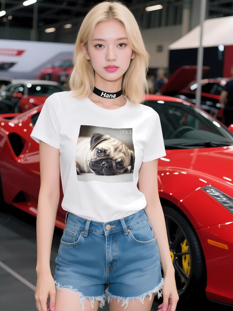 愛らしい瞳でこちらを見つめる、子犬パグのオリジナルイラストがプリントされたアパレルアイテムです。まるでおうちにいるかのような、リラックスした表情のパグが、あなたの日常をそっと癒してくれます。
