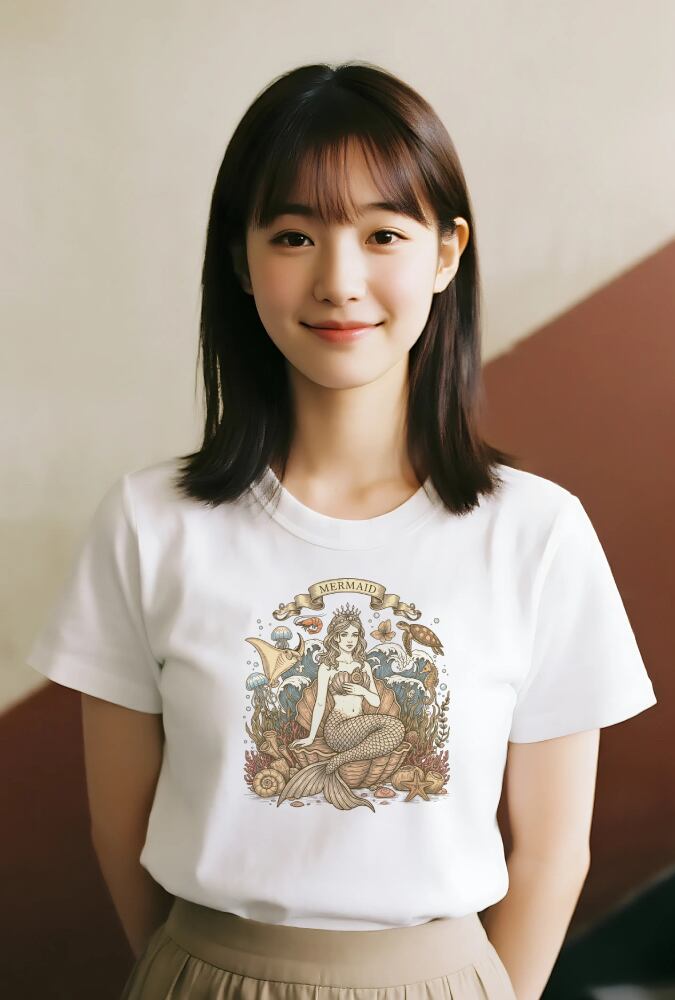 神秘的な海の生き物たちに囲まれた、優美なマーメイド(人魚姫)を描いたクラシカルなアートデザインTシャツが登場。古書やヴィンテージイラストを思わせる、温かみのあるセピア調の色彩で表現しました。