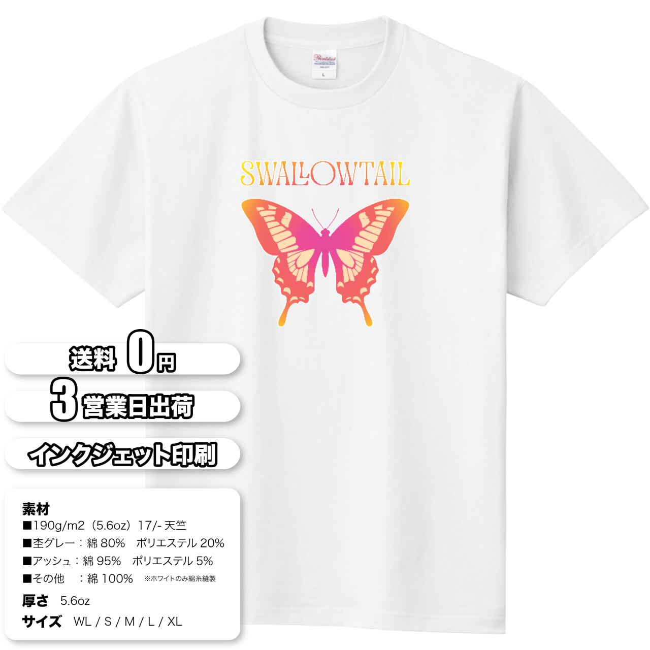 このTシャツは、見る人を魅了する幻想的なグラデーションカラーで描かれたアゲハ蝶(SWALLOWTAIL)をモチーフにした、他に類を見ないアートピースです。鮮やかなピンクから情熱的なオレンジへと移り変わる色合いは、まるで夏の夕暮れを閉じ込めたかのよう。大胆でありながらも繊細なデザインは、どんなコーディネートにも洗練されたアクセントを加えます。