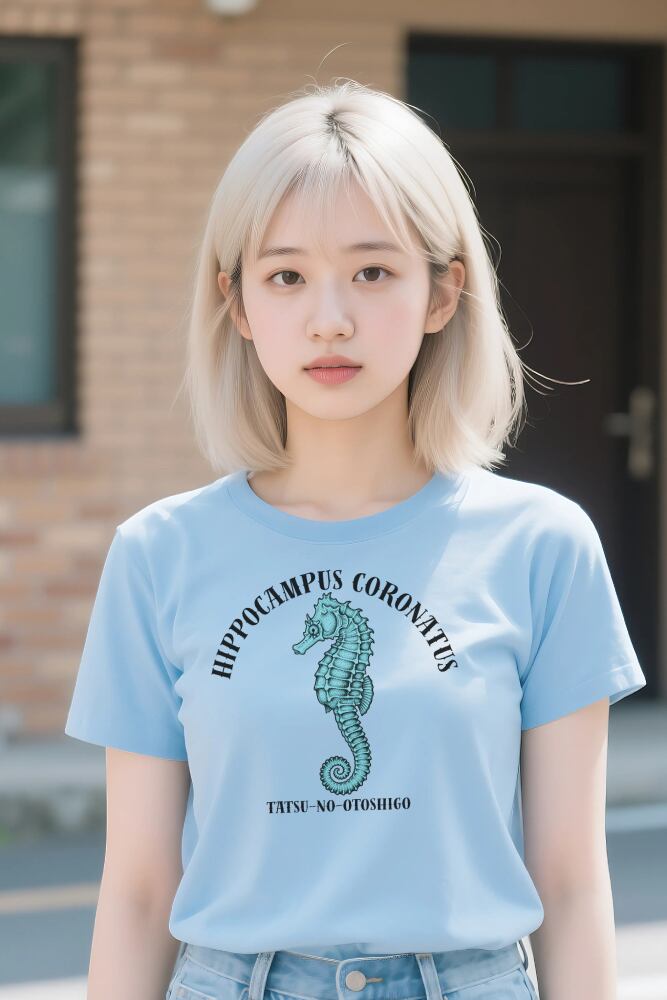 ユニークなデザインで、海を感じるスタイルをあなたに。タツノオトシゴの神秘的な魅力と、その学名「Hippocampus coronatus」が融合したオリジナルTシャツです。