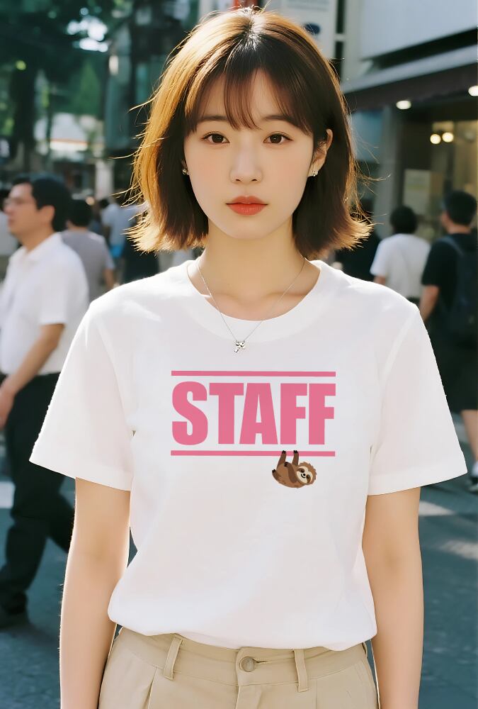 ユニークで目を引く「STAFF」Tシャツが登場!忙しい毎日にちょっとした癒しを届ける、キュートなナマケモノのイラストが特徴です。