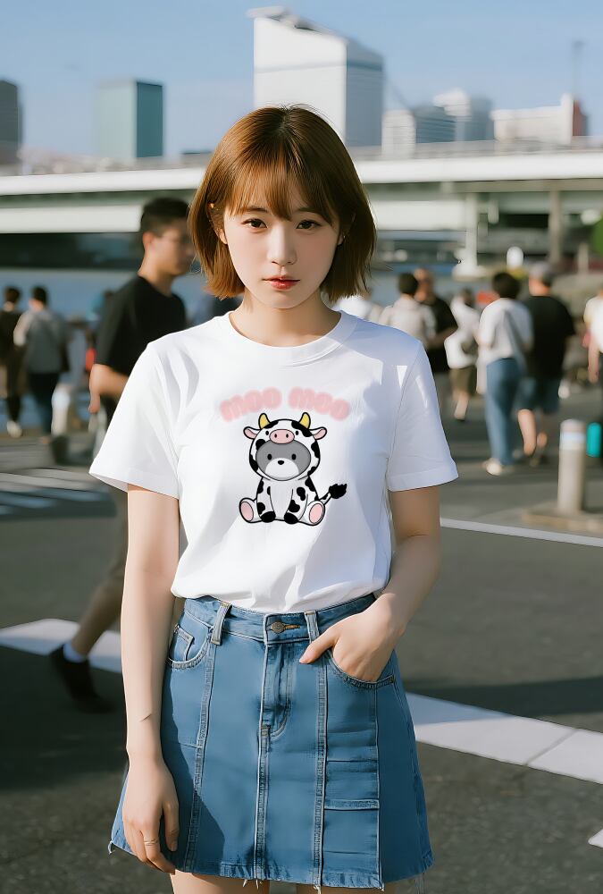 大きな瞳とほんわかした表情が、見ているだけで癒しを与えてくれるデザインです。牛柄の着ぐるみをまとったキャラクターから「MOO MOO♪」と響く文字が、遊び心と愛らしさをプラス。