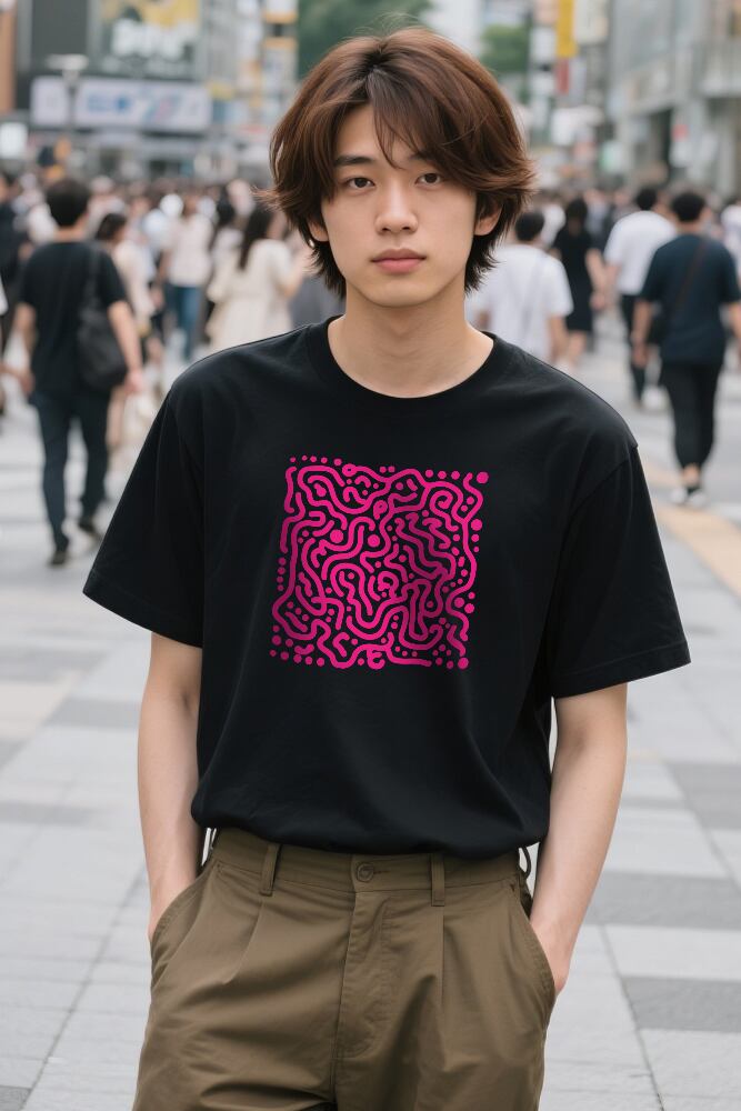 まるで迷路や生命の流れを思わせる有機的なピンクのラインアート地紋デザインが、ストリートファッションに新しい風を吹き込む一枚です。柔らかな曲線とドットが織りなすポップなデザインは、シンプルながら強い存在感を放ち、普段のコーディネートを一気にアートな印象へと変えてくれます。鮮やかに映えるピンクのグラフィックは、男女問わず着こなせるユニセックス仕様。カジュアルシーンはもちろん、ライブやイベント、アート好きの集まりなどでも注目されること間違いなし。日常にちょっとした刺激と遊び心をプラスする、TEEXオリジナルの限定デザインTシャツです。