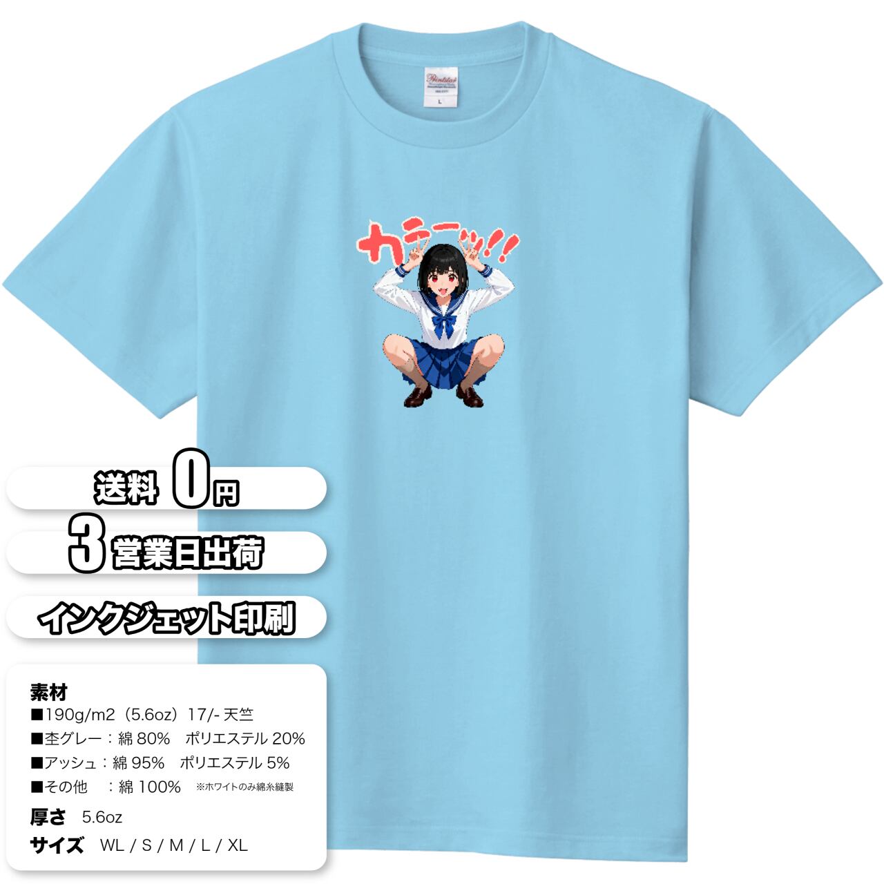 このイラストは、「カニーッ!!」と叫びながら蟹(かに)に擬態する、オリジナリティ溢れるスクールガールを大胆にプリント。ピースサインがカニのハサミを表現し、しゃがみ込むポーズが甲殻類特有のコミカルな動きを連想させます。